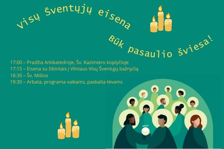 Rudens pabaigoje, spalio 31 d., kviečiame visus prisijungti prie gražios tradicijos – Visų Šventųjų eisenos „Būk pasaulio šviesa“. Tai šviesos ir vilties kelionė per Vilniaus senamiestį, skirta priminti, kad kiekvienas iš mūsų gali būti gerumo ir šviesos spindulys pasaulyje.